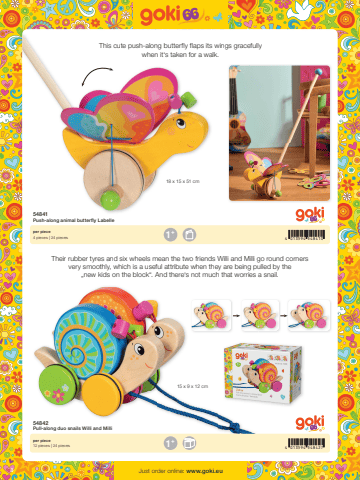 84 013594 5484104 013594 5484271+1+15 x 9 x 12 cm18 x 15 x 51 cmJust order online: www.goki.eu54841Push-along animal butterfl y Labelle54842Pull-along duo snails Willi and Milliper piece4 pieces | 24 piecesper piece12 pieces | 24 piecesThis cute push-along butterfly flaps its wings gracefully when it%u2018s taken for a walk.Their rubber tyres and six wheels mean the two friends Willi and Milli go round corners very smoothly, which is a useful attribute when they are being pulled by the %u201enew kids on the block%u201c. And there%u2018s not much that worries a snail.