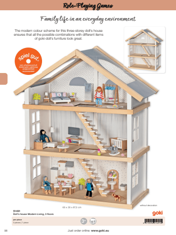 983 4 013594 514910+65 x 35 x 87,5 cmJust order online: www.goki.euRole-Playing Games51491Doll%u2018s house Modern Living, 3 floorsper piece0 pieces | 1 piecewithout decorationThe modern colour scheme for this three-storey doll%u2018s house ensures that all the possible combinations with different items of goki-doll%u2018s furniture look great.Family life in an everyday environment.