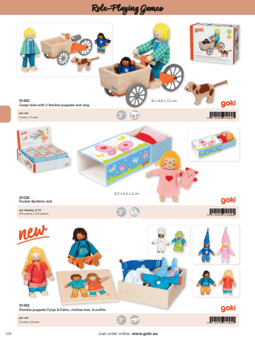1044 013594 5148284 013594 5153684 013594 5146203+3+3+16 x 6,8 x 7,5 cm8,2 x 5,4 x 3 cmJust order online: www.goki.euRole-Playing Games51482Flexible puppets Fynja & Fabio, clothes box, 6 outfits51536Pocket Bedtime doll51462Cargo bike with 2 flexible puppets and dogper set24 sets | 48 setsper display of 12216 pieces | 432 piecesper set6 sets | 12 sets