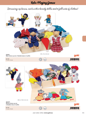 1054 013594 5191444 013594 2927193+3+26 x 13 x 5,5 cm26,3 x 12,9 x 5,4 cmJust order online: www.goki.euRole-Playing Games51914Bear dress-up set, 2 flexible bears, 8 outfitsSO271Mouse dress-up set, 2 flexible mice, 8 outfitsper set12 sets | 24 setsper set12 sets | 24 setsDressing-up boxes, each with 2 bendy dolls and 8 full sets of clothes!