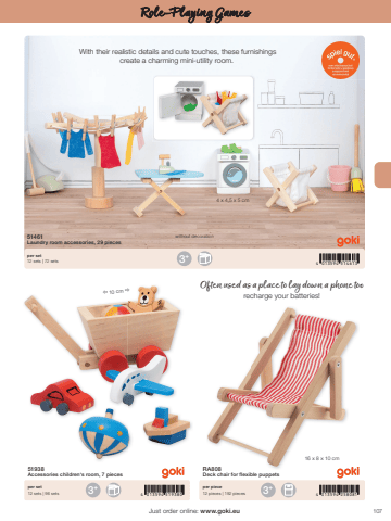 1073 4 013594 514613+3+ 3+4 013594 519380 4 013594 2580814 x 4,5 x 5 cm16 x 8 x 10 cm%u00ef 10 cm %u00f0Just order online: www.goki.euRole-Playing Games51461Laundry room accessories, 29 piecesper set12 sets | 72 sets51938Accessories children%u2018s room, 7 piecesRA808Deck chair for flexible puppetsper set12 sets | 96 setsper piece12 pieces | 192 pieceswithout decoration With their realistic details and cute touches, these furnishings create a charming mini-utility room. Often used as a place to lay down a phone tff recharge your batteries!