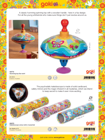 94 013594 5377284 013594 6067071+3+%u00ef 21 cm %u00f018,5 cm%u00ef 14,6 cm %u00f03,5 cmJust order online: www.goki.eu53772Humming top Sun swirl60670Kaleidoscope colour whirl, 3 assortedper piece0 pieces | 12 piecesper display of 1272 pieces | 144 piecesA classic humming spinning top with a wooden handle - here in a hip design. For all the young whirlwinds who make sure things don%u2018t just revolve around us. The psychedelic kaleidoscope is made of solid cardboard, safety mirrors and the magic inherent in all mysteries, which we intend to keep secret to make it even more exciting.