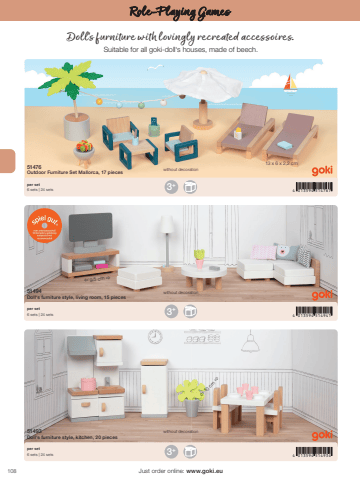 1084 013594 5147674 013594 5149414 013594 5149343+3+3+13 x 6 x 2,2 cm%u00ef 9,5 cm %u00f0%u00ef 10 cm %u00f0Just order online: www.goki.euRole-Playing Games51476Outdoor Furniture Set Mallorca, 17 pieces51494Doll%u2018s furniture style, living room, 15 pieces51493Doll%u2018s furniture style, kitchen, 20 piecesper set6 sets | 24 setsper set6 sets | 24 setsper set6 sets | 24 setswithout decorationwithout decorationwithout decorationDoll%u2018s furniture with lovingly recreated accessoires. Suitable for all goki-doll%u2018s houses, made of beech.