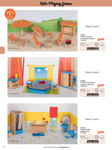 1104 013594 5191374 013594 5190694 013594 5190383+3+3+%u00ef 10,5 cm %u00f0%u00ef 14 cm %u00f0%u00ef 12 cm %u00f0Just order online: www.goki.euRole-Playing Games51913Garden furniture for flexible puppets, 9 pieces51906Furniture for flexible puppets, bedroom, 16 pieces51903Puppenm%u00f6belBadezimmer,17-teiligper set6 sets | 24 setsper set10 sets | 20 setsper set6 sets | 24 setswithout decorationwithout decorationwithout decorationBeech woodBeech woodBeech wood