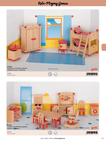 113%u00ef 14 cm %u00f03 4 013594 519519+%u00ef 13 cm %u00f03 4 013594 519533+Just order online: www.goki.euRole-Playing Games51951Furniture for flexible puppets, kitchen, 11 piecesper set9 sets | 18 sets51953Furniture for flexible puppets, children%u2018s room, 12 piecesper set6 sets | 24 setswithout decorationwithout decoration