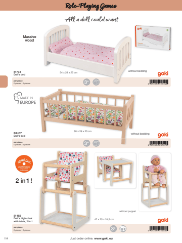 1144 013594 2510754 013594 5173484 013594 5148353+3+3+54 x 29 x 25 cm3+60 x 29 x 25 cm47 x 25 x 24,5 cmJust order online: www.goki.euRole-Playing GamesRA107Doll%u2019s bed51734Doll%u2019s bed51483Doll%u2018s high chair with table, 2 in 1per piece0 pieces | 6 piecesper piece0 pieces | 6 piecesper piece0 pieces | 8 piecesAfi a dofi could wantwithout beddingwithout beddingMassive wood2 in 1 !without puppet