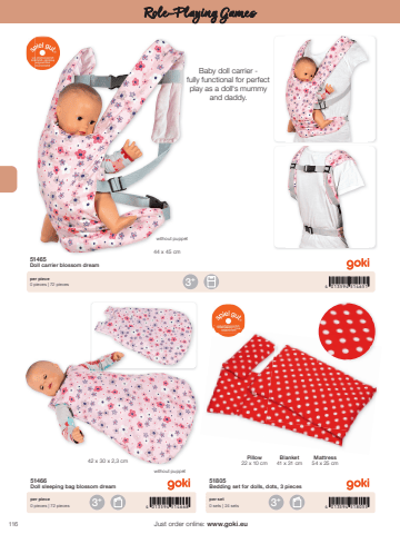 1163+ 3+4 013594 514668 4 013594 5180553 4 013594 514651+44 x 45 cm42 x 30 x 2,3 cmJust order online: www.goki.euRole-Playing Games51466Doll sleeping bag blossom dream51805Bedding set for dolls, dots, 3 piecesper piece0 pieces | 72 piecesper set0 sets | 24 sets51465Doll carrier blossom dreamper piece0 pieces | 72 piecesBaby doll carrier - fully functional for perfect play as a doll%u2018s mummy and daddy.without puppetwithout puppetPillow22 x 10 cmBlanket41 x 31 cmMattress54 x 25 cm