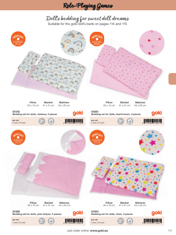 1173+3+3+3+4 013594 5158944 013594 5151844 013594 5156414 013594 518611Just order online: www.goki.euRole-Playing Games51589Bedding set for dolls, pink stripes, 3 pieces51518Bedding set for dolls, rainbow, 3 pieces51564Bedding set for dolls, stars, 3 pieces51861Bedding set for dolls, heart/crown, 3 piecesper set0 sets | 24 setsper set0 sets | 24 setsper set0 sets | 24 setsper set0 sets | 24 setsPillow22 x 10 cmPillow22 x 10 cmPillow22 x 10 cmPillow22 x 10 cmBlanket41 x 31 cmBlanket41 x 31 cmBlanket41 x 31 cmBlanket41 x 31 cmMattress54 x 25 cmMattress54 x 25 cmMattress54 x 25 cmMattress54 x 25 cmDoll%u2018s bedding for sweet doll dreamsSuitable for the goki-doll%u2018s beds on pages 114 and 115