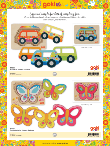 104 013594 5730474 013594 5730542+2+15 x 11 x 1,5 cm15 x 11 x 1,5 cmJust order online: www.goki.eu57304Puzzle car, 5 layers, 5 pieces57305Puzzle butterfl y, 5 layers, 5 piecesper piece12 pieces | 48 piecesper piece12 pieces | 48 piecesLayered puzzle for lots of puzzling fun. Combines exercises for hand-eye coordination and fine motor skills with simple %u201ejoie de vivre%u201c.