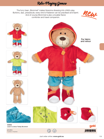 1192 4 013594 509527+%u00ef 45 cm %u00f0Just order online: www.goki.euRole-Playing Games50952Learn to dress Teddy Brommelper piece0 pieces | 12 piecesThe furry bear %u201eBrommel%u201c makes tiresome dressing into child%u2018s play. Buttons, zips, pressstuds; every kind of fastener can be practised and learnt. And of course Brommel is also a lovable friend, comforter and travel companion. Fur fabric and velour