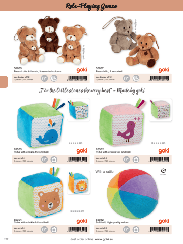 1220+ 0+4 013594 509558 4 013594 5095720+0+0+0+4 013594 6530394 013594 6530464 013594 6530224 013594 650427%u00ef 10,5 cm %u00f0%u00ef 8,5 cm %u00f08 x 8 x 8 cm8 x 8 x 8 cm8 x 8 x 8 cm10 cmJust order online: www.goki.euRole-Playing Games50955Bears Lotta & Lunah, 3 assorted colours50957Bears Milo, 2 assortedper display of 120 pieces | 144 piecesper display of 120 pieces | 144 pieces65303Cube with crinkle foil and bell65304Cube with crinkle foil and bell65302Cube with crinkle foil and bell65042Soft ball, high quality velourper set of 40 pieces | 128 piecesper set of 40 pieces | 128 piecesper set of 40 pieces | 128 piecesper set of 60 pieces | 126 pieces%u201eFor the liffl lest ones the very best%u201c - Made by gokiWith a rattle