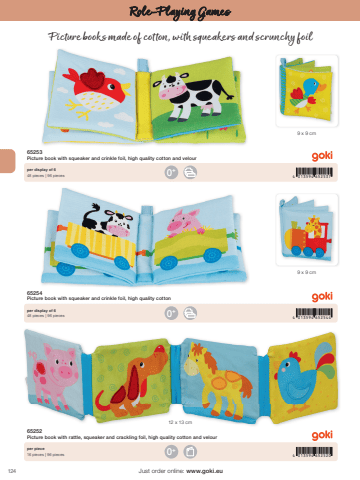 1244 013594 6525204 013594 6525444 013594 6525370+0+0+9 x 9 cm9 x 9 cm12 x 13 cmJust order online: www.goki.euRole-Playing Games65252Picture book with rattle, squeaker and crackling foil, high quality cotton and velour65254Picture book with squeaker and crinkle foil, high quality cotton65253Picture book with squeaker and crinkle foil, high quality cotton and velourper piece16 pieces | 96 piecesper display of 648 pieces | 96 piecesper display of 648 pieces | 96 piecesPicture book s made of cot ton, with squeakers and scrunchy foil