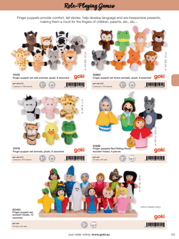 1251+ 1+4 013594 151252 4 013594 5096263+ 1+4 013594 154185 4 013594 518987%u00ef 7,5 - 8,5 cm %u00f0%u00ef 7,5 - 8,5 cm %u00f0%u00ef 7 - 8 cm %u00f0%u00ef 10,5 - 11 cm %u00f0%u00ef 10 - 13 cm %u00f03 4 013594 294010+Just order online: www.goki.euRole-Playing Games15125Finger puppet set wild animals, plush, 8 assorted50962Finger puppet set forest animals, plush, 8 assortedper set of 80 pieces | 1152 piecesper set of 80 pieces | 1152 pieces51898Finger puppets Red Riding Hood,wooden heads, 4 pieces15418Finger puppet set animals, plush, 6 assortedper set30 sets | 90 setsper set of 60 pieces | 720 piecesSO401Finger puppet set, wooden heads, 12 assortedper set30 sets | 60 setsFinger puppets provide comfort, tell stories, help develop language and are inexpensive presents, making them a must for the fingers of children, parents, etc., etc....without display stand