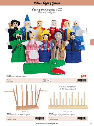 1274 4 013594 294508+4 013594 291996 4 013594 29400340 x 1,5 x 7 cm%u00ef 27 cm %u00f040 x 14 cmJust order online: www.goki.euRole-Playing GamesSO450Hand puppet set 2, 12 assortedper set0 sets | 4 setsSO199The display stand for 12 hand puppetsSO400Finger puppet display stand for 12 puppetsper piece0 pieces | 12 piecesper piece0 pieces | 24 piecesFor clear presentation of the finger puppetsThe big hand puppet set II consisting of 12 figures