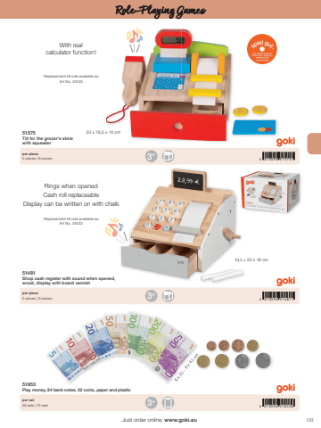 1314 013594 5157574 013594 5148114 013594 5185363+3+3+23 x 18,5 x 14 cm19,5 x 23 x 18 cm6 x 3,1 - 8 x 4,1 cmJust order online: www.goki.euRole-Playing Games51575Till for the grocer%u2018s storewith squeaker51481Shop cash register with sound when opened, wood, display with board varnish51853Play money, 84 bank notes, 32 coins, paper and plasticper piece0 pieces | 8 piecesper piece0 pieces | 8 piecesper set36 sets | 72 setsWith real calculator function !Replacement till rolls available asArt No. 51533Replacement till rolls available asArt No. 51533Rings when openedCash roll replaceableDisplay can be written on with chalk
