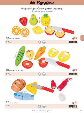 1374 013594 5156344 013594 5159864 013594 5159793+3+3+%u00ef 7,3 cm %u00f0%u00ef12 cm %u00f0%u00ef 11 cm %u00f0Just order online: www.goki.euRole-Playing Games51563Food with velcro, 13 pieces51598Vegetables with velcro, 12 pieces51597Fruit with velcro, 13 piecesper set12 sets | 36 setsper set12 sets | 24 setsper set12 sets | 24 setsFruit and vegetables with velcro fasteners. For the first attempts at cutting!