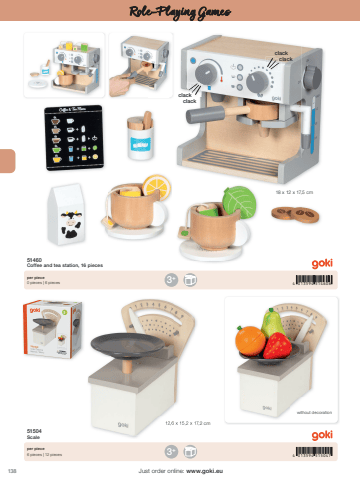 1384 013594 5146064 013594 5150473+3+18 x 12 x 17,5 cm12,6 x 15,2 x 17,2 cmJust order online: www.goki.euRole-Playing Games51460Coffee and tea station, 16 pieces51504Scaleper piece0 pieces | 6 piecesper piece6 pieces | 12 piecesclackclackclackclackwithout decoration