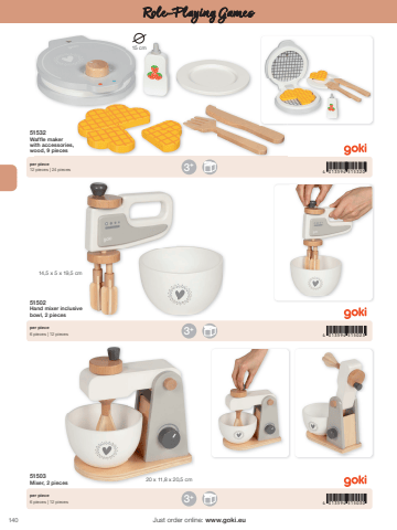 1404 013594 5150304 013594 5150234 013594 5153203+3+3+20 x 11,8 x 20,5 cm14,5 x 5 x 19,5 cm15 cmJust order online: www.goki.euRole-Playing Games51503Mixer, 2 pieces51502Hand mixer inclusive bowl, 2 pieces51532Waffle maker with accessories, wood, 9 piecesper piece6 pieces | 12 piecesper piece6 pieces | 12 piecesper piece12 pieces | 24 pieces