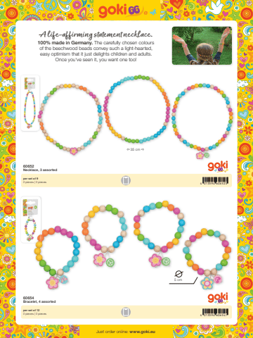 134 013594 6065234 013594 606547%u00ef 35 cm %u00f05 cmJust order online: www.goki.eu60652Necklace, 3 assorted60654Bracelet, 4 assortedper set of 9 0 pieces | 0 piecesper set of 12 0 pieces | 0 piecesA life-affirming statement necklace. 100% made in Germany. The carefully chosen colours of the beechwood beads convey such a light-hearted, easy optimism that it just delights children and adults. Once you%u2018ve seen it, you want one too!