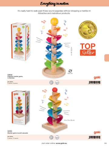 1494 013594 5378104 013594 5383293+3+%u00ef 37,5 cm %u00f015,8 cm13 x 13 x 30 cmJust order online: www.goki.euEverything in motion53781Marble game sound cascade53832Pagoda marble game, 3 marblesper piece0 pieces | 12 piecesper piece0 pieces | 6 piecesIt%u2018s really hard to walk past these sound pagodas without dropping a marble in! Attractive and melodious products.