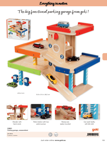 1593 4 013594 538213+51,9 x 31,4 x 38,5 cmJust order online: www.goki.euEverything in motion53821Parking garage, unassembledper piece0 pieces | 4 piecesElevator with hand crankRamps are easily mountedCar wash facility with felt clothPetrol station with two petrol pumpswithout carsThe big functional parking garage from goki !
