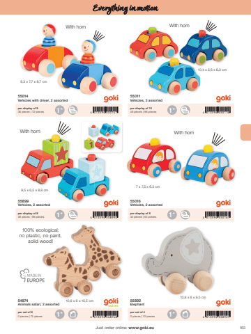 1631+1+1+1+4 013594 5501474 013594 5589904 013594 5501164 013594 5501611+4 013594 548748nature1+4 013594 55892110,4 x 5,6 x 6,3 cm9,3 x 7,7 x 8,7 cm7 x 7,5 x 6,3 cm 9,5 x 6,5 x 8,8 cm10,8 x 6 x 10,5 cm10,8 x 6 x 9,5 cmJust order online: www.goki.euEverything in motion55014Vehicles with driver, 2 assorted55899Vehicles, 2 assorted55011Vehicles, 3 assorted55016Vehicles, 2 assortedper display of 936 pieces | 72 piecesper display of 848 pieces | 96 piecesper display of 1248 pieces | 96 piecesper display of 832 pieces | 64 pieces54874Animals safari, 2 assortedper set of 60 pieces | 72 pieces55892Elephantper set of 40 pieces | 72 pieces100% ecological: no plastic, no paint, solid wood!With horn With hornWith horn With horn