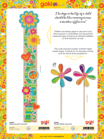 154 013594 606554 4 013594 63858616 cm%u00ef 37,2 cm %u00f0%u00ef 93 cm %u00f0Just order online: www.goki.eu60655Measuring stick Floranella63858Windmill Whirly, 2assortedper piece6 pieces | 12 piecesper set of 60 pieces | 36 pieces%u201eThe days in the life of a child should be like running across a meadow of flowers.%u201dThis multi-coloured wooden windmill makes people happy. It stands for an everyday whimsy that we should all be receptive to. Children are always eager to see how much they%u2018ve grown in centimetres, but the goki-66 measuring tape should be an attractive addition to their bedroom as well.