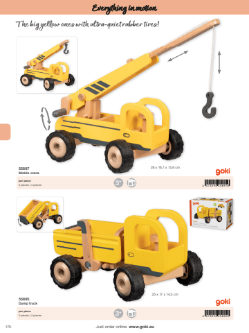 1704 013594 5589764 013594 5589523+3+28 x 16,7 x 15,6 cm25 x 17 x 14,5 cmJust order online: www.goki.euEverything in motion55897Mobile crane55895Dump truckper piece0 pieces | 4 piecesper piece0 pieces | 4 piecesThe big yefl ow ones with ultra-quiet rubber tires!