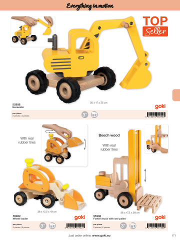 1713 4 013594 558983+3+ 3+4 013594 559621 4 013594 55938620 x 17 x 25 cm28 x 12,5 x 19 cm 36 x 17,5 x 39 cmJust order online: www.goki.euEverything in motion55898Excavatorper piece0 pieces | 4 pieces55962Wheel loader55938Forklift truck with one palletper piece0 pieces | 6 piecesper piece0 pieces | 6 piecesWith real rubber tiresBeech woodWith real rubber tires