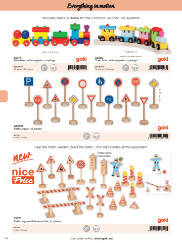 17425 x 4 x 6,5 cm2+ 2+4 013594 559744 4 013594 558662%u00ef 28 cm %u00f04 013594 3839744 013594 5377353+3+%u00ef 10 cm %u00f0Just order online: www.goki.euEverything in motion55974Train Peru, with magnetic couplings55866Train Turin, with magnetic couplingsper piece12 pieces | 48 piecesper piece12 pieces | 48 piecesWM397Traffic signs I, 15 pieces53773Traffic sign set Policeman Ole, 21 pieces per set0 sets | 24 setsper set0 sets | 24 setswithout wooden tracksWooden trains suitable for the common wooden rail systems.Help the traffic warden direct the traffic - this set includes all the equipment.Traffic lightsadjustable