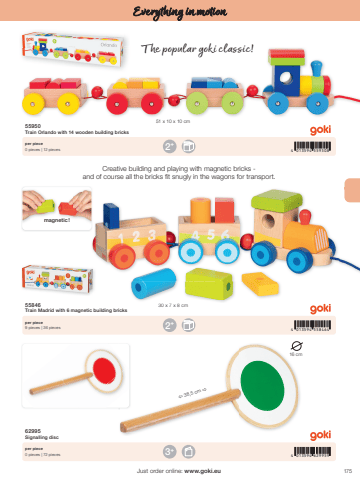 1754 013594 5595084 013594 5584644 013594 6299592+2+3+%u00ef 38,5 cm %u00f016 cm51 x 10 x 10 cm30 x 7 x 8 cmJust order online: www.goki.euEverything in motion55950Train Orlando with 14 wooden building bricks55846Train Madrid with 6 magnetic building bricks62995Signalling discper piece0 pieces | 12 piecesper piece9 pieces | 36 piecesper piece0 pieces | 72 piecesThe popular goki classic!Creative building and playing with magnetic bricks - and of course all the bricks fit snugly in the wagons for transport.magnetic !