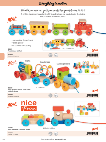 1764 013594 5584194 013594 5583032+2+2 4 013594 558471+55 x 7,6 x 8,8 cm37 x 8 x 9 cm26,5 x 9,5 x 9,5 cmJust order online: www.goki.euEverything in motion55841Freight train GK-Rail55830Train Marseille, 5 building bricksper piece12 pieces | 24 piecesper piece0 pieces | 12 pieces55847Train Rio with blocks, bead maze, rattle, 7 piecesper piece12 pieces | 24 piecesWorld premiere: goki presents the g%u001a ds train 2025 !A child%u2018s bedroom has plenty of things that can be loaded onto the trains, which makes it even more fun.%u2022 removable tipper truck%u2022 sliding door%u2022 5 dowels for loadingRattle Bead mazeBuilding blocks