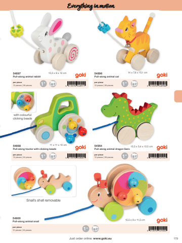 1791+1+1+1+4 013594 5489774 013594 5486874 013594 5489604 013594 54954715,5 x 8 x 12 cm 14 x 7,8 x 15,1 cm11 x 11 x 10 cm 15,5 x 5,4 x 12,5 cm1 4 013594 549004+15,5 x 9 x 11,5 cmJust order online: www.goki.euEverything in motion54897Pull-along animal rabbit54868Pull-along tractor with clicking beads54896Pull-along animal cat54954Pull-along animal dragon Saroper piece12 pieces | 36 piecesper piece12 pieces | 24 piecesper piece12 pieces | 36 piecesper piece12 pieces | 36 pieces54900Pull-along animal snailper piece12 pieces | 24 pieceswith colourful clicking beadsSnail%u2019s shell removable