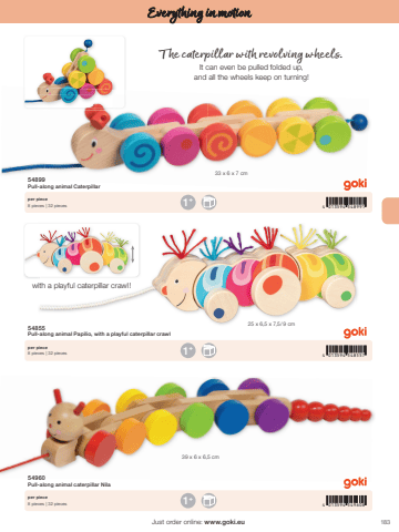 1834 013594 5496084 013594 5485574 013594 5489911+1+1+33 x 6 x 7 cm25 x 6,5 x 7,5 / 9 cm39 x 6 x 6,5 cmJust order online: www.goki.euEverything in motion54960Pull-along animal caterpillar Nila54855Pull-along animal Papilio, with a playful caterpillar crawl54899Pull-along animal Caterpillarper piece8 pieces | 32 piecesper piece8 pieces | 32 piecesper piece8 pieces | 32 piecesThe caterpillar with revolving wheels.It can even be pulled folded up, and all the wheels keep on turning!with a playful caterpillar crawl !
