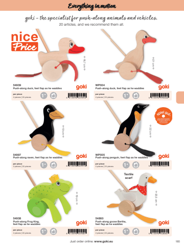 185%u00ef 22 cm %u00f01+1+1+1+1+1+4 013594 5493944 013594 5499744 013594 5493874 013594 3900404 013594 3900574 013594 548601%u00ef 16,7 cm %u00f0%u00ef 21 cm %u00f0%u00ef 19 cm %u00f0%u00ef 19 cm %u00f0%u00ef 22,5 cm %u00f0Just order online: www.goki.euEverything in motion54939Push-along duck, feet flap as he waddles54997Push-along raven, feet flap as he waddles54938Push-along Frog King, feet flap as he waddlesWP004Push-along duck, feet flap as he waddlesWP005Push-along penguin, feet flap as he waddles54860Push-along goose Bertha, feet flap as he waddlesper piece4 pieces | 24 piecesper piece4 pieces | 24 piecesper piece4 pieces | 24 piecesper piece4 pieces | 24 piecesper piece4 pieces | 24 piecesper piece4 pieces | 24 piecesgoki - the specialist for push-along animals and vehicles.20 articles, and we recommend them all.Textile scarf