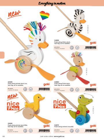 1861+1+1+1+1+4 013594 5484654 013594 5484894 013594 5487554 013594 5488234 013594 549592%u00ef 16 cm %u00f0%u00ef 22 cm %u00f0%u00ef 20,5 cm %u00f0Just order online: www.goki.euEverything in motion54848Push-along animal duck Lou,feet flap as he waddles54846Push-along animal duck Ellie,feet flap as he waddles54882Push-along Punk-duck, fleet flap as he waddles54875Push-along animal crocodile54959Push-along Zebra duck, feet flap as he waddlesper piece4 pieces | 24 piecesper piece4 pieces | 24 piecesper piece4 pieces | 24 piecesper piece4 pieces | 24 piecesper piece4 pieces | 24 pieces