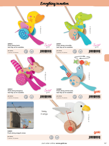 187%u00ef 19 cm %u00f0%u00ef 19 cm %u00f0%u00ef 18,5 cm %u00f01+1+1+1+4 013594 5491344 013594 5491274 013594 5491104 013594 5489841 4 013594 548618+%u00ef 19 cm %u00f0%u00ef 19 cm %u00f0Just order online: www.goki.euEverything in motion54913Push-along duck, feet flap as he waddles54911Push-along crocodile, feet flap as he waddles54912Push-along kangaroo, feet flap as he waddles54898Push-along animal seal,feet flap as he waddlesper piece4 pieces | 24 piecesper piece4 pieces | 24 piecesper piece4 pieces | 24 piecesper piece0 pieces | 24 pieces54861Push-along seagull Jonasper piece4 pieces | 24 piecesbeatsit wings