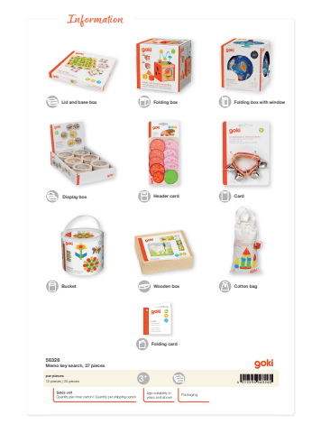 Sales unitQuantity per inner carton I Quantity per shipping cartonAge suitability in years and above PackagingInformationLid and base box Folding box Folding box with windowDisplay box Header card CardBucket Wooden box Cotton bagFolding card3 4 013594 563260+Sales unitQuantity per inner carton I Quantity per shipping cartonAge suitability in years and above Packaging56326Memo key search, 37 piecesper pieces12 pieces | 24 piecesKubbWikingerspielVikings gameJeu de vikingsJuego vikingoGioco vichinghi5+21pcs2-6