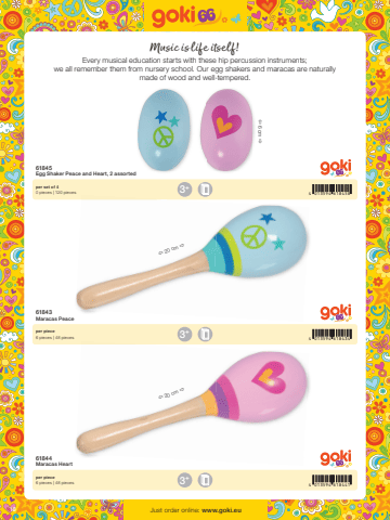 184 013594 6184414 013594 6184344 013594 6184583+3+3+%u00ef 6 cm %u00f0%u00ef 20 cm %u00f0%u00ef 20 cm %u00f0Just order online: www.goki.eu61844Maracas Heart61843Maracas Peace61845Egg Shaker Peace and Heart, 2 assortedper piece6 pieces | 48 piecesper piece6 pieces | 48 piecesper set of 40 pieces | 120 piecesMusic is life itself!Every musical education starts with these hip percussion instruments; we all remember them from nursery school. Our egg shakers and maracas are naturally made of wood and well-tempered.