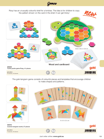 1994 013594 5630244 013594 5631614+3+6 x 6 x 0,4 cm23,9 x 22,3 x 0,8 cmJust order online: www.goki.euGames56302Turtle puzzle game Rosy, 41 pieces56316Colorful tangram world, 37 piecesper piece20 pieces | 40 piecesper piece16 pieces | 32 piecesRosy has an unusually colourful shell for a tortoise. The idea is for children to copy the pattern shown on the card in the shell. It can get tricky!The goki-tangram game consists of colourful pieces and templates that encourage children to make shapes and patterns.Wood and cardboard
