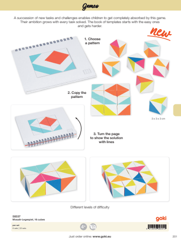 2014 4 013594 583374+3 x 3 x 3 cmJust order online: www.goki.euGames58337Mosaik-Legespiel, 16 cubesper set8 sets | 32 setsA succession of new tasks and challenges enables children to get completely absorbed by this game. Their ambition grows with every task solved. The book of templates starts with the easy ones and gets harder.1. Choose a pattern2. Copy the pattern3. Turn the page to show the solution with linesDifferent levels of difficulty