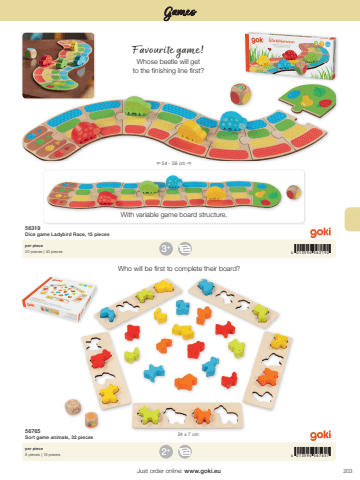 2034 013594 5676574 013594 5631922+3+%u00ef 54 - 58 cm %u00f024 x 7 cmJust order online: www.goki.euGames56765Sort game animals, 32 pieces56319Dice game Ladybird Race, 15 piecesper piece8 pieces | 16 piecesper piece20 pieces | 40 piecesFavourite game!Whose beetle will get to the finishing line first?With variable game board structure.Who will be first to complete their board?%u00a0
