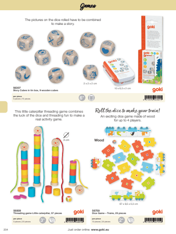 2046 4 013594 563079+3+ 2+4 013594 568098 4 013594 5675962 x 2 x 2 cm10 x 6,5 x 2 cm67 x 9,5 x 0,3 cm3 cmJust order online: www.goki.euGames56307Story Cubes in tin box, 9 wooden cubesper piece0 pieces | 72 pieces56809Threading game Little caterpillar, 57 pieces56759Dice Game %u2013 Trains, 25 piecesper piece0 pieces | 20 piecesper piece12 pieces | 24 piecesThe pictures on the dice rolled have to be combined to make a story.Roll the dice to make your train! An exciting dice game made of wood for up to 4 players.This little caterpillar threading game combines the luck of the dice and threading fun to make a real activity game.Wood
