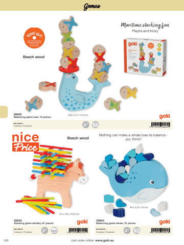 2064 4 013594 566650+5+ 4+4 013594 569507 4 013594 56664313,6 x 2 x 11,5 cm12 x 1,6 x 10,5 cm16 x 2,5 x 15 cmJust order online: www.goki.euGames56665Balancing game seal, 13 piecesper piece0 pieces | 24 pieces56950Stacking game donkey, 61 pieces56664Balancing game whale, 21 piecesper piece0 pieces | 72 piecesper piece0 pieces | 24 piecesBeech woodBeech woodNothing can make a whale lose its balance - you think?Maritime stacking funPlayful and tricky
