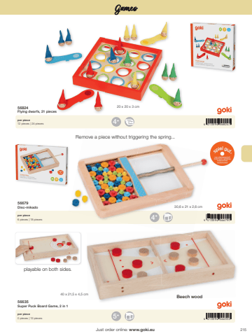 2154 013594 5682414 013594 5667974 013594 5663534+4 4 013594+5+40 x 21,5 x 4,5 cm30,6 x 21 x 2,6 cm20 x 20 x 3 cmJust order online: www.goki.euGames56824Flying dwarfs, 21 pieces56679Disc-mikado56635Super Puck Board Game, 2 in 1per piece12 pieces | 24 piecesper piece6 pieces | 18 piecesper piece0 pieces | 12 piecesRemove a piece without triggering the spring...playable on both sides.Beech wood