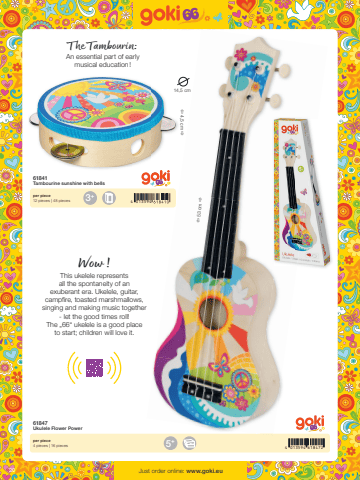 205 4 013594 618472+3 4 013594 618410+%u00ef53 cm %u00f014,5 cm%u00ef 4,5 cm %u00f0Just order online: www.goki.eu61847Ukulele Flower Powerper piece4 pieces | 16 pieces61841Tambourine sunshine with bellsper piece12 pieces | 48 piecesWow !This ukelele represents all the spontaneity of an exuberant era. Ukelele, guitar, campfire, toasted marshmallows, singing and making music together - let the good times roll! The %u201e66%u201c ukelele is a good place to start; children will love it.The Tambourin:An essential part of early musical education !