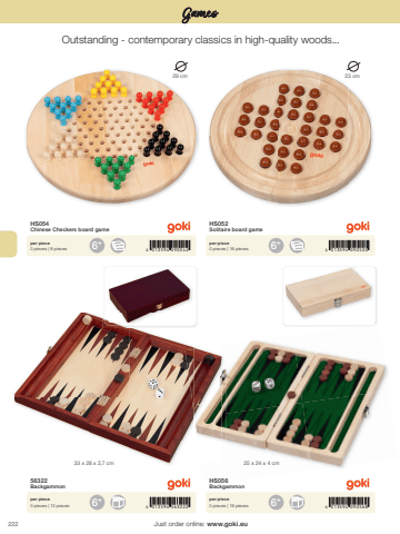 2226+ 6+4 013594 090544 4 013594 0905206+ 6+4 013594 563222 4 013594 09056829 cm 23 cm33 x 28 x 2,7 cm 25 x 24 x 4 cmJust order online: www.goki.euGamesHS054Chinese Checkers board gameHS052Solitaire board gameper piece0 pieces | 8 piecesper piece0 pieces | 16 pieces56322BackgammonHS056Backgammonper piece0 pieces | 12 piecesper piece0 pieces | 16 piecesOutstanding - contemporary classics in high-quality woods...