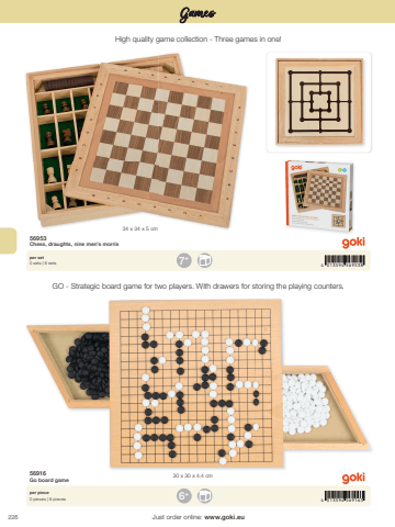 2264 013594 5695384 013594 5691637+6+30 x 30 x 4,4 cm34 x 34 x 5 cmJust order online: www.goki.euGames56953Chess, draughts, nine men%u2019s morris56916Go board gameper set0 sets | 6 setsper piece0 pieces | 6 piecesHigh quality game collection - Three games in one!GO - Strategic board game for two players. With drawers for storing the playing counters.