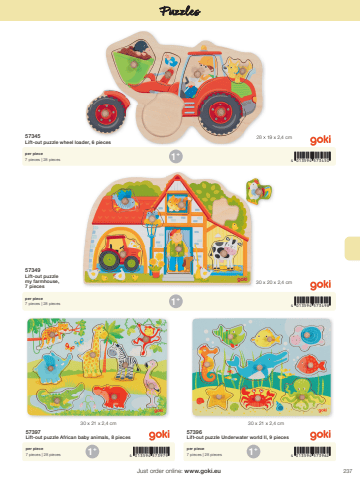 2374 013594 5734984 013594 5734501+1+30 x 21 x 2,4 cm 30 x 21 x 2,4 cm28 x 19 x 2,4 cm1+ 1+4 013594 573979 4 013594 57396228 x 19 x 2,4 30 x 20 x 2,4 cmJust order online: www.goki.euPuzzles57349Lift-out puzzle my farmhouse, 7 pieces57345Lift-out puzzle wheel loader, 6 piecesper piece7 pieces | 28 piecesper piece7 pieces | 28 pieces57397Lift-out puzzle African baby animals, 8 pieces57396Lift-out puzzle Underwater world II, 9 piecesper piece7 pieces | 28 piecesper piece7 pieces | 28 pieces