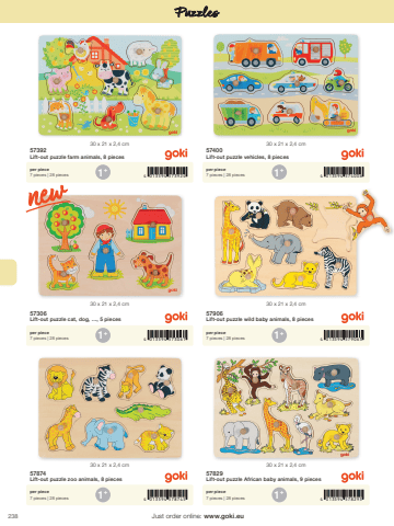 23830 x 21 x 2,4 cm30 x 21 x 2,4 cm30 x 21 x 2,4 cm30 x 21 x 2,4 cm30 x 21 x 2,4 cm30 x 21 x 2,4 cm1+1+1+1+1+1+4 013594 5787454 013594 5730614 013594 5739244 013594 5782954 013594 5790634 013594 574006Just order online: www.goki.euPuzzles57874Lift-out puzzle zoo animals, 8 pieces57306Lift-out puzzle cat, dog, %u2026, 5 pieces57392Lift-out puzzle farm animals, 8 pieces57829Lift-out puzzle African baby animals, 9 pieces57906Lift-out puzzle wild baby animals, 8 pieces57400Lift-out puzzle vehicles, 8 piecesper piece7 pieces | 28 piecesper piece7 pieces | 28 piecesper piece7 pieces | 28 piecesper piece7 pieces | 28 piecesper piece7 pieces | 28 piecesper piece7 pieces | 28 pieces